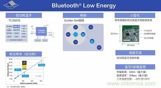 針(zhen)對(dui)這(zhe)樣(yang)的(de)應(ying)用(yong)場(chang)景(jing),東(dong)芝(zhi)推(tui)出(chu)了(le)整(zheng)合(he)了(le)控(kong)製(zhi)芯(xin)片(pian)的(de)藍(lan)牙(ya)芯(xin)片(pian),是(shi)迄(qi)今(jin)實(shi)現(xian)的(de)功(gong)耗(hao)最(zui)低(di)藍(lan)牙(ya)芯(xin)片(pian),新(xin)的(de)藍(lan)牙(ya)芯(xin)片(pian)可(ke)以(yi)實(shi)現(xian)組(zu)網(wang),可(ke)應(ying)用(yong)到(dao)體(ti)積(ji)很(hen)小(xiao)的(de)設(she)備(bei)上(shang),且(qie)可(ke)以(yi)通(tong)過(guo)新(xin)版(ban)本(ben),實(shi)現(xian)長(chang)達(da)600米通信距離,最大電流是3.3毫安,一顆鈕扣電池可以使用3到4年。