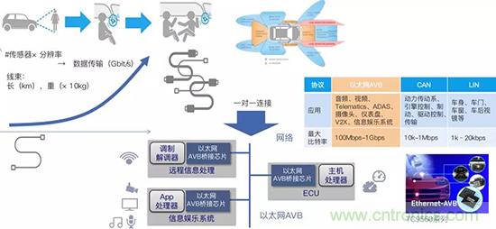 他(ta)表(biao)示(shi)隨(sui)著(zhe)自(zi)動(dong)駕(jia)駛(shi)和(he)車(che)聯(lian)網(wang)的(de)發(fa)展(zhan),汽(qi)車(che)搭(da)載(zai)越(yue)來(lai)越(yue)多(duo)的(de)傳(chuan)感(gan)器(qi)和(he)越(yue)來(lai)越(yue)多(duo)的(de)攝(she)像(xiang)頭(tou)。這(zhe)帶(dai)來(lai)的(de)挑(tiao)戰(zhan)就(jiu)是(shi)數(shu)據(ju)傳(chuan)輸(shu)需(xu)求(qiu)越(yue)來(lai)越(yue)高(gao)。為(wei)了(le)提(ti)升(sheng)數(shu)據(ju)傳(chuan)輸(shu),車(che)內(nei)線(xian)纜(lan)會(hui)長(chang)達(da)到(dao)幾(ji)公(gong)裏(li)重(zhong)達(da)幾(ji)十(shi)公(gong)斤(jin),為(wei)了(le)簡(jian)化(hua)連(lian)接(jie),汽(qi)車(che)行(xing)業(ye)推(tui)出(chu)了(le)新(xin)的(de)車(che)專(zhuan)用(yong)以(yi)太(tai)網(wang),它(ta)可(ke)與(yu)現(xian)有(you)的(de)車(che)載(zai)用(yong)車(che)身(shen)數(shu)據(ju)通(tong)訊(xun)係(xi)統(tong)通(tong)信(xin),所(suo)以(yi)激(ji)發(fa)了(le)車(che)載(zai)以(yi)太(tai)網(wang)橋(qiao)接(jie)芯(xin)片(pian)的(de)需(xu)求(qiu)。