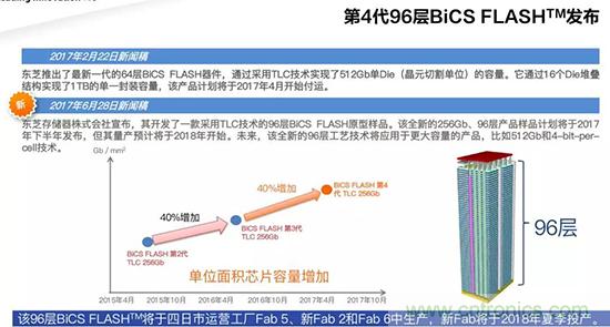 東芝電子(中國)有限公司副總經理野村尚司表示東芝在2017年已經推出了最新一代的64層BiCS FLASH器件,通過采用TLC技術實現了512Gb單Die(晶元切割單位)的容量。它通過16個Die堆疊 結構實現了1TB的單一封裝容量,該產品計劃於2017年4月開始付運。