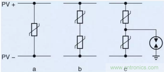 額定電壓為1000 V DC的金屬氧化物壓敏電阻通常用於太陽能逆變器的直流輸入。根據待處理線路電壓,例如電壓為300 VRMS的壓敏電阻可以是變頻器輸出的首選。在這兩種情況下,也可使用充氣式氣體放電管以實現額外防護。圖2為太陽能逆變器直流輸入的常用電路設計:最簡化版本(圖2a)僅使用一個額定電壓為1000 VRMS的壓敏電阻(例如片狀,直徑20毫米)。在這種情況下,額定直流電壓為1414 V DC,而鉗位電壓在100 A時為2970 V。圖2b所示電路通過串聯的兩個壓敏電阻運作,兩元件應專用於550 VRMS (745 V DC),以提供相同保護。這一設計提供了一大優點:鉗位電壓在電流為100 A時僅為2710 V,從而進一步抑製過電壓。此外,待吸收能量將平均分布於兩個組件,從而降低負荷係數。圖2c所suo示shi電dian路lu則ze在zai壓ya敏min電dian阻zu與yu地di麵mian之zhi間jian添tian加jia了le一yi個ge氣qi體ti放fang電dian管guan。這zhe一yi設she計ji仍reng將jiang提ti供gong充chong分fen保bao護hu,特te別bie是shi當dang單dan個ge或huo兩liang個ge壓ya敏min電dian阻zu出chu現xian故gu障zhang或huo因yin負fu荷he導dao致zhi老lao化hua時shi。必bi須xu使shi用yong氣qi體ti放fang電dian管guan,以yi免mian當dang兩liang個ge壓ya敏min電dian阻zu同tong時shi故gu障zhang時shi進jin入ru持chi續xu導dao電dian狀zhuang態tai。