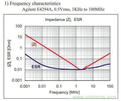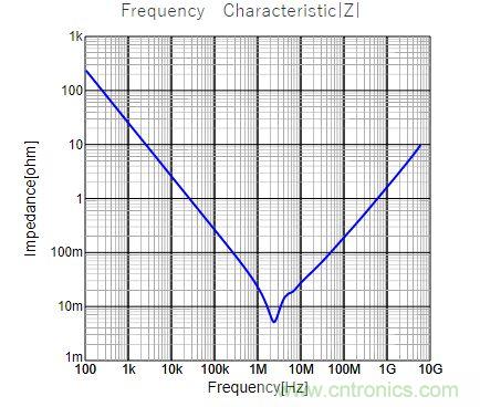 MLCC有經典的V型阻抗-頻率曲線。隨著頻率升高,寄生電感的影響開始凸顯,阻抗先變小再變大,這是MLCC的固有特性。曲線中的最低點就是MLCC的自諧振頻率。