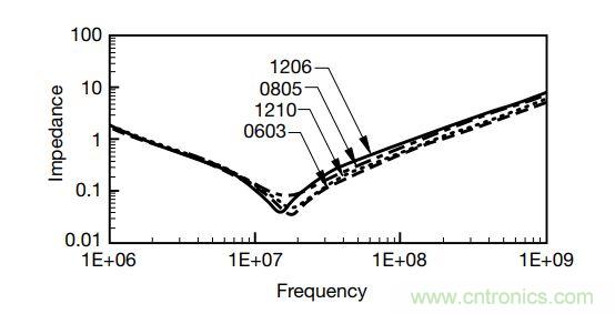 一般來說,直插件的引線較長,其寄生電感比SMD大;電解電容內部有大量卷繞結構的鋁箔,寄生電感比其它工藝的電容大。1206尺寸的MLCC內部電極麵積和焊接端子截麵明顯比0805大,所以尺寸越大的MLCC,自諧振頻率就越低。