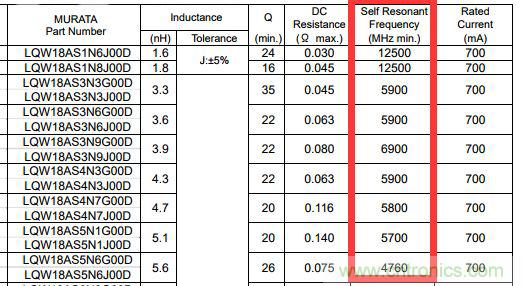 圖1 murata LQW18AS係列spec中的SRF信息