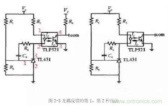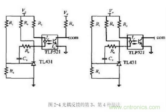 圖2-3所示接法的工作原理是:當輸出電壓升高時,原邊電流If增大,輸出電流Ic增大,由於Ic已經超過了電壓誤差放大器的電流輸出能力,com腳電壓下降,占空比減小,輸出電壓減小;反之,當輸出電壓下降時,調節過程類似。