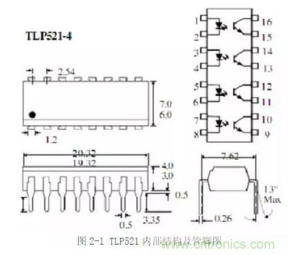 常用於反饋的光耦型號有TLP521、PC817等。這裏以TLP521為例,介紹這類光耦的特性。圖2-1所示為光耦內部結構圖以及引腳圖。