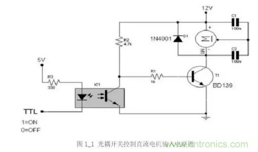光耦(opticalcoupler)亦稱光電隔離器、光耦合器或光電耦合器。它是以光為媒介來傳輸電信號的器件,通常把發光器(紅外線發光二極管LED)與受光器(光敏半導體管)封裝在同一管殼內。當輸入端加電信號時發光二極管發出光線,光敏三極管接受光線之後就產生光電流,從輸出端流出,從而實現了“電—光—電”轉換。典型應用電路如下圖1-1所示。
