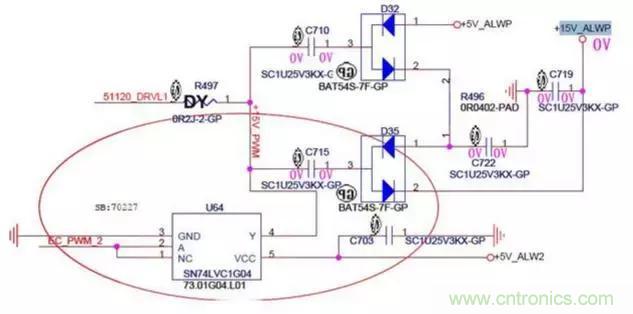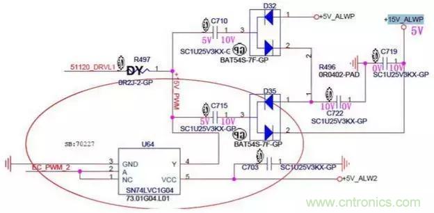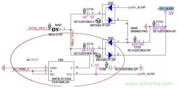 1.由於電容兩端的電壓不能突變,此時C715兩端的電壓為左邊5V,右邊為10V,然後電流經過D35的2引腳對C719電容充電,充完電後C719的電壓升到了10V。