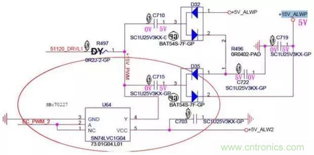 當通電時,右上角+5V_ALWP通過D32的1引腳對C710、C722、C715、C719進行充電,此時電容上兩端的電位如上圖所示。此時+15V_ALWP輸出端口的實際電平為5V。
