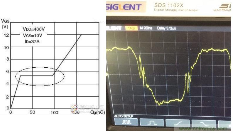 有了以上模型,就好辦了,尤其從運放這張圖中,可以一眼看出,這就是一個反相積分電路,當輸入電阻較大時,開關速度比較緩慢,Cgd這顆積分電容影響不明顯,但是當開關速度比較高,而且VDD供電電壓表高,比如310V下,通過Cgd的電流比較大,強的積分很容易引起振蕩,這個振蕩叫米勒振蕩。所以Cgd也叫米勒電容,而在MOS管guan開kai關guan導dao通tong或huo者zhe關guan斷duan的de那na段duan時shi間jian,也ye就jiu是shi積ji分fen那na段duan時shi間jian,叫jiao米mi勒le平ping台tai,如ru下xia圖tu圓yuan圈quan中zhong的de那na部bu分fen為wei米mi勒le平ping台tai,右you邊bian的de是shi振zhen蕩dang嚴yan重zhong的de米mi勒le振zhen蕩dang: