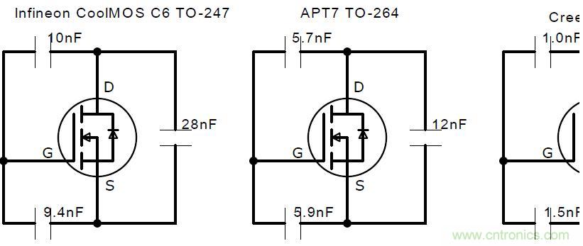 從圖上可以看出,Inifineon6代MOS管和APT7代MOS管性能遠遠不如碳化矽性能,它的各個指標都很小,當米勒振蕩通過其他手段無法降低時,可以考慮更換更小的米勒電容MOS管,尤其需要重視Cgd要盡可能的小於Cgs。
