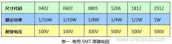 同樣,耐壓值選擇不合適的情況下,也會因為電阻被擊穿而導致係統設計的失敗。舉個例子:AC-DC開關電源模塊在設計的輸入前端,根據安規 GB4943.1標準的要求,在保證插頭或連接器斷開後,在輸入端L、N上的滯留電壓在1S之內衰減到初始值的37%,因此,在設計時一般會采用並接一個 或兩個MΩ級(ji)阻(zu)抗(kang)的(de)電(dian)阻(zu)進(jin)行(xing)能(neng)量(liang)泄(xie)放(fang),而(er)輸(shu)入(ru)端(duan)是(shi)高(gao)壓(ya),即(ji)電(dian)阻(zu)兩(liang)端(duan)是(shi)要(yao)承(cheng)受(shou)高(gao)壓(ya)的(de),當(dang)電(dian)阻(zu)的(de)耐(nai)壓(ya)值(zhi)低(di)壓(ya)輸(shu)入(ru)端(duan)高(gao)壓(ya)的(de)情(qing)況(kuang)下(xia),就(jiu)會(hui)產(chan)生(sheng)失(shi)效(xiao)。以(yi)下(xia)表(biao)一(yi)是(shi)常(chang)見(jian)SMT厚膜電阻的參數,最終選型時還要和選購器件的廠家核實。