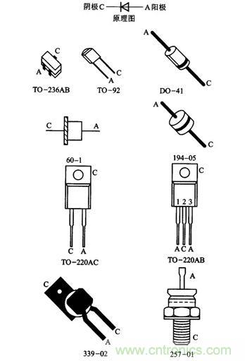 其它不同的封裝用不同的圖形表示。以辨認引腳,有少數幾種印上肖特基二極管符號。雖然看不見標記,但是圖8-24的194-05封裝用了這種方法。TO-220AC封裝有兩個陰極引腳,其中金屬片使兩個陽極連通。引腳和金屬片都可以用作肖特基二極管和電路連接端。而TO-220AB有兩個陽極引腳。由於它內部有二個肖特基二極管,陽極有不同的端,但是內部兩個陰極是連接在一起的。