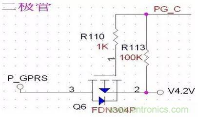 來看這個電路,控製信號PGC控製V4.2是否給P_GPRS供電。此電路中,源漏兩端沒有接反,R110與R113存在的意義在於R110控製柵極電流不至於過大,R113控製柵極的常態,將R113上拉為高,截至PMOS,同時也可以看作是對控製信號的上拉。當MCU內部管腳並沒有上拉時,即輸出為開漏時,並不能驅動PMOS關閉,此時,就需要外部電壓給予的上拉,所以電阻R113起到了兩個作用。R110可以更小,到100歐姆也可。