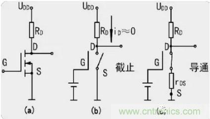 uGS>開啟電壓UT:MOS管工作在導通區,漏源電流iDS=UDD/(RD+rDS)。其中,rDS為MOS管導通時的漏源電阻。輸出電壓UDS=UDD·rDS/(RD+rDS),如果rDS《RD,則uDS≈0V,MOS管處於“接通”狀態,其等效電路如上圖(c)所示。