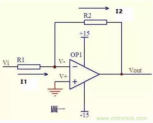 圖一運放的同向端接地=0V,反向端和同向端虛短,所以也是0V,反向輸入端輸入電阻很高,虛斷,幾乎沒有電流注入和流出,那麼R1和R2相當於是串聯的,流過一個串聯電路中的每一隻組件的電流是相同的,即流過R1的電流和流過R2的電流是相同的。 流過R1的電流I1 = (Vi - V-)/R1 ……a 流過R2的電流I2 = (V- - Vout)/R2 ……b V- = V+ = 0 ……c I1 = I2 ……d 求解上麵的初中代數方程得Vout = (-R2/R1)*Vi 這就是傳說中的反向放大器的輸入輸出關係式了。