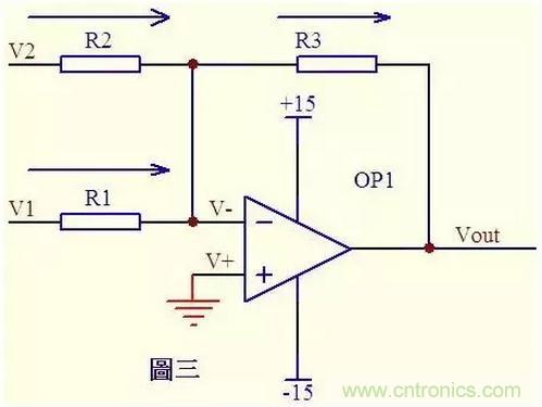 圖三中,由虛短知: V- = V+ = 0 ……a 由虛斷及基爾霍夫定律知,通過R2與R1的電流之和等於通過R3的電流, 故 (V1 – V-)/R1 + (V2 – V-)/R2 = (Vout – V-)/R3 ……b 代入a式,b式變為V1/R1 + V2/R2 = Vout/R3 如果取R1=R2=R3,則上式變為Vout=V1+V2,這就是傳說中的加法器了。