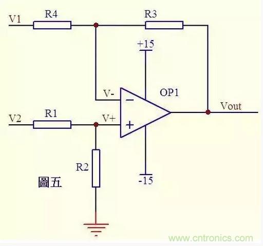 圖五由虛斷知,通過R1的電流等於通過R2的電流,同理通過R4的電流等於R3的電流,故有 (V2 – V+)/R1 = V+/R2 ……a (V1 – V-)/R4 = (V- - Vout)/R3 ……b 如果R1=R2, 則V+ = V2/2 ……c 如果R3=R4, 則V- = (Vout + V1)/2 ……d 由虛短知 V+ = V- ……e 所以 Vout=V2-V1 這就是傳說中的減法器了。