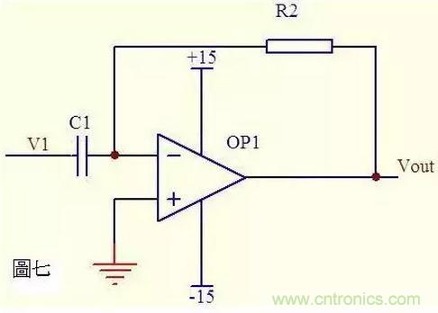 圖七中由虛斷知,通過電容C1和電阻R2的電流是相等的,由虛短知,運放同向端與反向端電壓是相等的。則: Vout = -i * R2 = -(R2*C1)dV1/dt 這是一個微分電路。如果V1是一個突然加入的直流電壓,則輸出Vout對應一個方向與V1相反的脈衝。