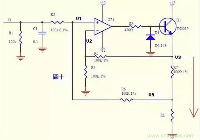 電流可以轉換成電壓,電壓也可以轉換成電流。圖十就是這樣一個電路。上圖的負反饋沒有通過電阻直接反饋,而是串聯了三極管Q1的發射結,大家可不要以為是一個比較器就是了。隻要是放大電路,虛短虛斷的規律仍然是符合的!