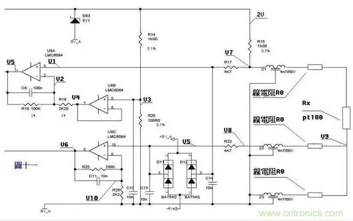 來一個複雜的,圖十一是一個三線製PT100前置放大電路。PT100傳感器引出三根材質、線徑、長度完全相同的線,接法如圖所示。有2V的電壓加在由R14、R20、R15、Z1、PT100及其線電阻組成的橋電路上。Z1、Z2、Z3、D11、D12、D83及各電容在電路中起濾波和保護作用,靜態分析時可不予理會,Z1、Z2、Z3可視為短路,D11、D12、D83及各電容可視為開路。 由電阻分壓知, V3=2*R20/(R14+20)=200/1100=2/11 ……a 由虛短知,U8B第6、7腳 電壓和第5腳電壓相等 V4=V3 ……b 由虛斷知,U8A第2腳沒有電流流過,則流過R18和R19上的電流相等。 (V2-V4)/R19=(V5-V2)/R18 ……c 由虛斷知,U8A第3腳沒有電流流過, V1=V7 ……d 在橋電路中R15和Z1、PT100及線電阻串聯,PT100與線電阻串聯分得的電壓通過電阻R17加至U8A的第3腳, V7=2*(Rx+2R0)/(R15+Rx+2R0) …..e 由虛短知,U8A第3腳和第2腳電壓相等, V1=V2 ……f 由abcdef得, (V5-V7)/100=(V7-V3)/2.2 化簡得 V5=(102.2*V7-100V3)/2.2 即 V5=204.4(Rx+2R0)/(1000+Rx+2R0) – 200/11 ……g 上式輸出電壓V5是Rx的函數 我們再看線電阻的影響。Pt100最下端線電阻上產生的電壓降經過中間的線電阻、Z2、R22,加至U8C的第10腳,由虛斷知, V5=V8=V9=2*R0/(R15+Rx+2R0) ……a (V6-V10)/R25=V10/R26 ……b 由虛短知, V10=V5 ……c 由式abc得 V6=(102.2/2.2)V5=204.4R0/[2.2(1000+Rx+2R0)] ……h 由式gh組成的方程組知,如果測出V5、V6的值,就可算出Rx及R0,知道Rx,查pt100分度表就知道溫度的大小了。