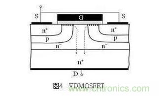 【答】如圖4所示,源-漏電流是從芯片表麵向下流動的,並在電流通路的兩側是pn結,因此這種電流輸運的過程,從工作原理上來看,就相當於是一個寄生JFET。從而可以把VDMOSFET等效為一個MOSFET與一個寄生JFET的串聯組合,其中很大部分n-漂移區就相當於是寄生JFET的溝道。