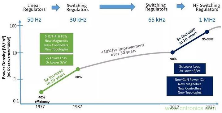 功率密度(AC-DC轉換器~300W);線性調節器;開關調節器;高頻開關調節器;新磁性元件;新控製器;新拓撲結構;2倍低損耗;3倍低成本/W;10年5倍提升;超過30年每年<10%改善;十年5倍提升;新GaN功率IC;效率。