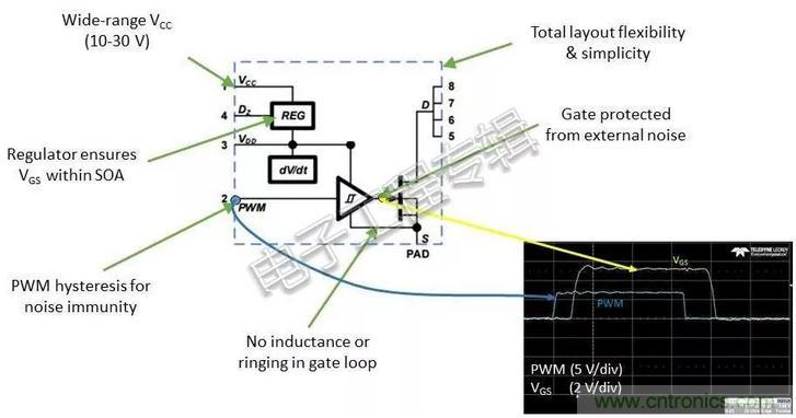 寬範圍Vcc;調節器可保護SOA內的VGS;滯後的PWM可抗噪聲幹擾;整體布局靈活簡潔;柵極可防止外部噪聲。