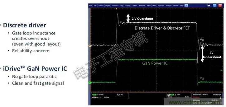 沒有柵極阻抗或電阻的分立解決方案會產生不穩定的電路。 如果添加了阻抗,它會變得穩定,但也會導致很長的開關周期。 因此,如果可以直接連接驅動器輸出和柵極輸入,那麼就可以快速運行並保持穩定。壓擺率隻需要一個電阻即可搞定。 因此,集成意味著一種非常可控的高性能器件。