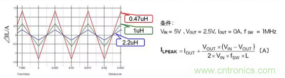 在這裏,為加深對電感工作的理解,進一步說明電感值變化時電感電流如何變化的情形。下圖表示在相同工作條件下將電感值設為0.4μH、1μH、2.2μH時ILPEAK。
