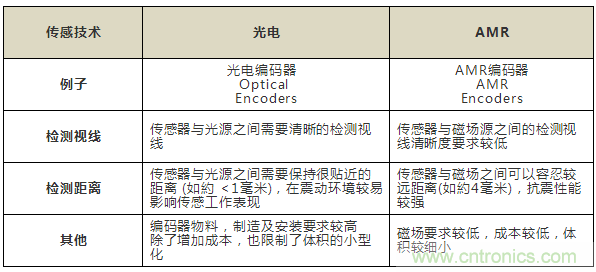 與傳統光學傳感技術比較,AMR技術可提供較小巧的外觀、低成本,並且更適合在惡劣環境下工作,例如肮髒及溫度變化的工作環境中。表1列舉了兩者之間的比較,從中可以明顯看出在無刷直流電機中使用AMR的優點。