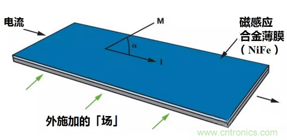 基於AMR原理的傳感器的材料電阻率取決於相對於電流方向的磁化方向。AMR傳感器是在磁飽和狀態下工作,因此外加的磁場的主導了電阻變化。當外磁場和電流方向平行時,電阻最大;而當施加的電場垂直於載流磁感應合金的平麵時,電阻最小。圖1顯示了AMR傳感器工作原理的簡化圖。