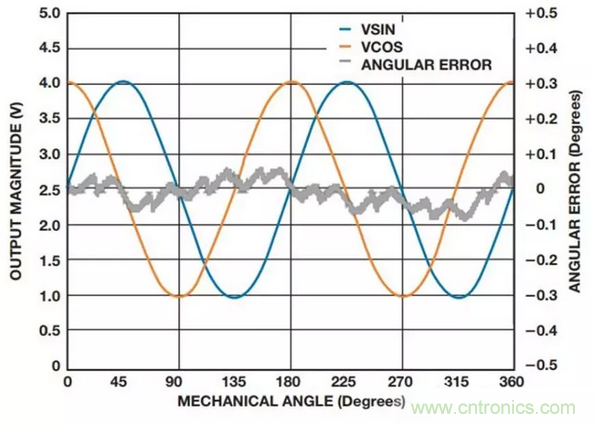 以Analog Devices公司的ADA4571 係列為例,圖2顯示了旋轉磁場施加在360° 機械旋轉情形時ADA4571的典型高輸出電平和角度誤差。經微控製器進行偏移校正後,典型誤差小於0.1°。