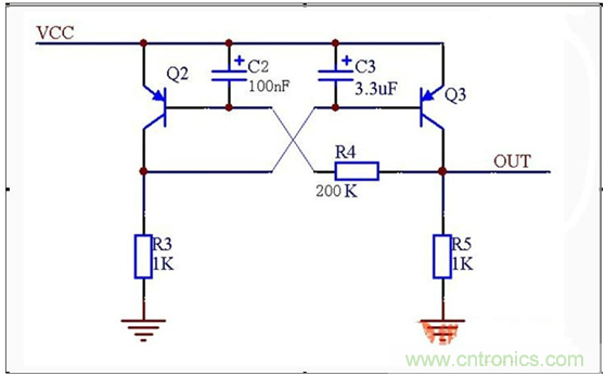 C2和c3很重要,在自鎖後,重啟電路就靠這兩個電容,否則啟動失敗。原理是上電時,電容兩端電壓不能突變,C2使得Q2基極在上電瞬間保持高電平,使得Q2不導通。C3則使得上電瞬間Q3基極保持低電平,使得Q3導通Vout有電壓。這樣R5位高電平,鎖住導通。