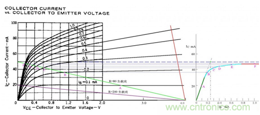 這裏理解起來有些抽象,那我就具體的畫個圖,就很好理解了。在三極管截止的時候CE兩端的電壓是最大的,我們設為4.5V,在IB逐漸加大的過程中,VCE在逐漸變小,而飽和狀態下的Ic是由RC決定的,請看圖: