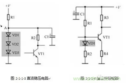 二極管簡易穩壓電路中主要利用二極管的管壓降基本不變特性。二極管的管壓降特性:二極管導通後其管壓降基本不變,對矽二極管而言這一管壓降是0.6V左右,對鍺二極管而言是0.2V左右。上圖所示是由普通3隻二極管構成的簡易直流穩壓電路。電路中的VD1、VD2和VD3是普通二極管,它們串聯起來後構成一個簡易直流電壓穩壓電路。圖2-1-1-3.