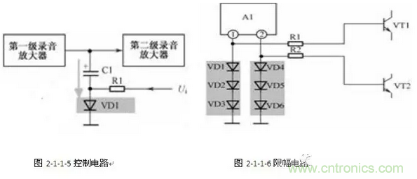 二極管導通之後,它的正向電阻大小隨電流大小變化而有微小改變,正向電流愈大,正向電阻愈小;反之則大。利用二極管正向電流與正向電阻之間的特性,可以構成一些自動控製電路。如圖9-43所示是一種由二極管構成的自動控製電路,又稱ALC電路(自動電平控製電路),它在磁性錄音設備中(如卡座)的錄音電路中經常應用。圖2-1-1-5。