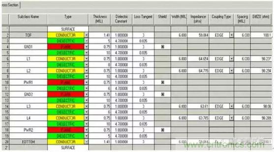 由上麵的分析知道,PCB板的疊層設置和信號的耦合以及阻抗計算都有著密切的關係,所以在開始PCB設計之前必須進行疊層設計,然後進行信號的阻抗計算。在本設計中的疊層設計見下圖: