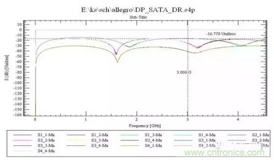以上的相關步驟設置好以後就可以進行仿真了,allegro可以進行信號的反射仿真、串擾仿真,差分線還要進行眼圖分析。當然仿真也分前仿真和後仿真,在利用allegro進行PCBshejideshihouhaixuyaojiehefangzhendejieguoshishideduishejijinxingxiugaiyidadaofuheyaoqiudemude。youyufangzhenguochengfuza,buzhoufansuo,zaicibuyiyijinxingmiaoshu, chafenduidebuxianyouliangdianyaozhuyi,yishiliangtiaoxiandechangduyaojinliangyiyangchang,dengchangshiweilebaozhenglianggechafenxinhaoshikebaochixiangfanjixing,jianshaogongmofenliang。lingyishiliangxiandejianju(此間距由差分阻抗決定)要一直保持不變,也就是要保持平行。平行的方式有兩種,一為兩條線走在同一走線層(side-by-side),一為兩條線走在上下相鄰兩層(over-under)。一般以前者side-by-side 實(shi)現(xian)的(de)方(fang)式(shi)較(jiao)多(duo)。等(deng)距(ju)則(ze)主(zhu)要(yao)是(shi)為(wei)了(le)保(bao)證(zheng)兩(liang)者(zhe)差(cha)分(fen)阻(zu)抗(kang)一(yi)致(zhi),減(jian)少(shao)反(fan)射(she)。對(dui)差(cha)分(fen)對(dui)的(de)布(bu)線(xian)方(fang)式(shi)應(ying)該(gai)要(yao)適(shi)當(dang)的(de)靠(kao)近(jin)且(qie)平(ping)行(xing)。所(suo)謂(wei)適(shi)當(dang)的(de)靠(kao)近(jin)是(shi)因(yin)為(wei)這(zhe)間(jian)距(ju)會(hui)影(ying)響(xiang)到(dao)差(cha)分(fen)阻(zu)抗(kang)(differential impedance)的值, 此值是設計差分對的重要參數。需要平行也是因為要保持差分阻抗的一致性。若兩線忽遠忽近, 差分阻抗就會不一致, 就會影響信號完整性(signal integrity)及時間延遲(timing delay)。從仿真的S參數曲線圖可以分析差分對的差分阻抗(differential impedance),以及信號完整性。下麵給出本設計中的關鍵信號仿真波形以供加以說明。 從仿真圖例圖5看到,S11在0-3.0GHz 的頻域範圍內其最劣化的指標為:-16.770db以下 ,S22(粉紅色的曲線)也不劣於-17db。 這說明該差分對的差分阻抗(differential impedance)接近設計指標,信號完整性得到了保證。