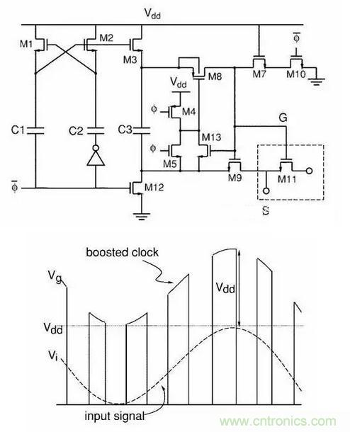 電路用在各種ADC之前的Sample電路,可以讓ADC實現rail to rail的input,sample電路的工作電壓超過Vdd,極大的減少了了setting time,而且幾乎沒有reliability的問題。電路裏沒有任何一個器件是可以被減少或者改變位置的。此電路直接使得ADC的發展往前躍進了一大步,現在已經幾乎成為除ΔΣ之外各種ADC的標配,成為曆史上最經典的模擬電路之一。當然,電路原理一眼看去也不是很好理解。