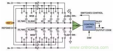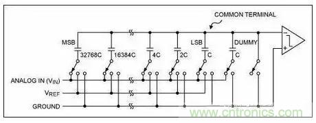 每個時鍾沿,比較器對電容上的電壓和地作比較, 由此結果來決定下一個電容是否接入電路。