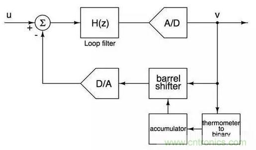 基本思想是快速遍曆DAC中的每一個電流元從而減少電流元mismatch對ADC信噪比的影響,僅僅通過幾個簡單的數電模塊就實現對電流元mismatch的first order noise shaping,非常巧妙。