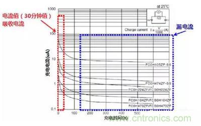 圖1中顯示了KEMET公司“FC係列”產品在室溫下的漏電流特性和測量電路。當超級電容器充電時,存在穩定的寄生電流(Parasitic Current)。超級電容器通過離子“吸收”和“釋放”造成充電,並且當離子試圖到達活性炭的細孔內部時,充電開始時的寄生電流很高。該初始電流稱為“吸收電流”。該充電電流隨著時間的推移而減小,並且隨著時間的推移變得穩定。在開始施加電壓30分鍾後的主電流分量是吸收電流。當吸收電流減小時,漏電流成為主要成分。