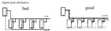 對應地線回路規則,實際上也是為了盡量減小信號的回路麵積,多見於一些比較重要的信號,如時鍾信號,同步信號;對dui一yi些xie特te別bie重zhong要yao,頻pin率lv特te別bie高gao的de信xin號hao,應ying該gai考kao慮lv采cai用yong銅tong軸zhou電dian纜lan屏ping蔽bi結jie構gou設she計ji,即ji將jiang所suo布bu的de線xian上shang下xia左zuo右you用yong地di線xian隔ge離li,而er且qie還hai要yao考kao慮lv好hao如ru何he有you效xiao的de讓rang屏ping蔽bi地di與yu實shi際ji地di平ping麵mian有you效xiao結jie合he。