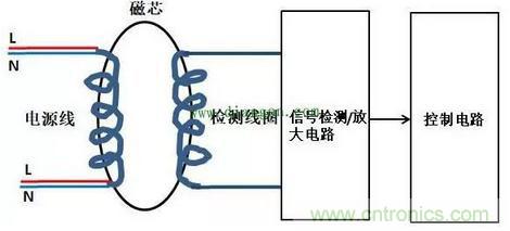 如圖1所示,漏電保護器正常工作時,因未漏電,故隻有零線和火線有電流流動,即i1不存在,i0=i2,通過圖2分析得知,由於零線和火線電流大小相等,方向相反磁場相互抵消,故磁芯不生產耦合磁場,圖4的檢測線圈不生產感應電勢,控製電路不動作;當有漏電發送時,i1電流存在,火線電流i0=i1+i2,零線電流為i2,火線電流大於零線電流,不對稱,故磁芯有耦合磁場傳遞到檢測線圈那,檢測線圈產生感應電勢,導致控製電路動作切斷電源。
