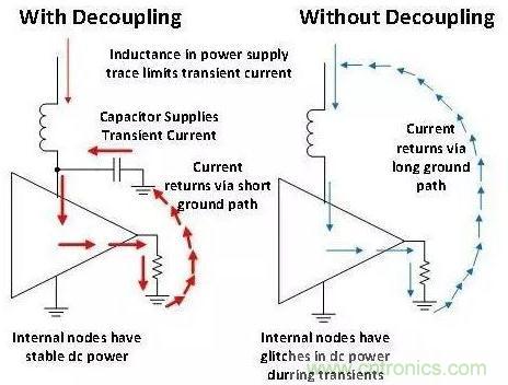 圖 2 闡述了為什麼去耦非常重要。需要注意的是,電源線跡的電感將限製暫態電流。 去耦電容與器件非常接近,因此電流路徑的電感很小。在暫態過程中,該電容器可在非常短的時間內向器件提供超大量的電流。 未采用去耦電容的器件無法提供暫態電流,因此放大器的內部節點會下垂(通常稱為幹擾)。無去耦電容的器件其內部電源幹擾會導致器件工作不連續,原因是內部節點未獲得正確的偏置。