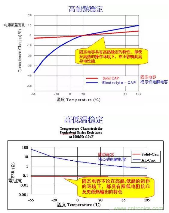 傳統電解電容比較容易受運用環境地溫度和濕度影響,在高低溫穩定性方麵稍差。即使是在零下攝氏55度至105度,固態電容地ESR電阻抗可以達到在0.1~0.3歐母,但電解電容則會因溫度而改變。