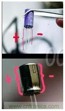 對於直插的有極性的電容來說,好分辨,長腿為正,短腿為負。電解電容有黑色標誌的為負,也對應著短腿。