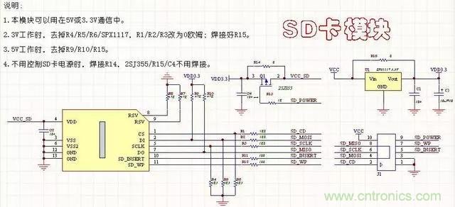 6、SD卡模塊電路(帶鎖)本電路與SD卡的封裝有關,注意與封裝對應。此電路可以通過端口控製SD卡的電源,比較完善,可以用於5V和3.3V。但是要注意,有些器件的使用,5V和3.3是不一樣的。