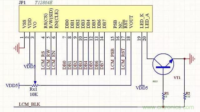7、LCM12864液晶模塊(ST7920)本電路是常見的12864電路,價格便宜,帶中文字庫。可以通過PSB端口的電平來設置其工作在串口模式還是並行模式,帶背光控製功能。