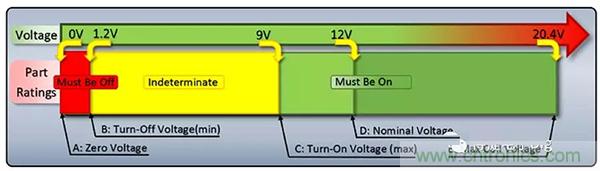 從1.2VDC到9VDC, 繼電器處於不確定的範圍內。(黃色區域)